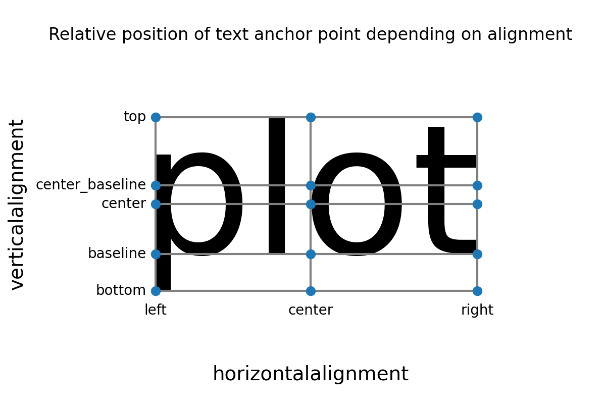文本根据属性 horizontalalignment (默认值: left )和 verticalalignment (默认值: baseline )相对于其锚点对齐.