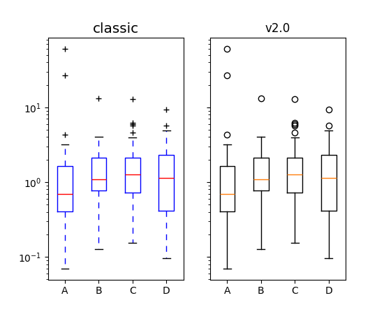 对于新的默认值,除了中位数和平均值线(如果绘制)之外,所有内容都是黑色的,它们被设置为当前颜色循环的前两个元素.此外,默认的离群值标记现在是空心圆,这保持了加号重叠而不过多地遮盖数据的能力.
