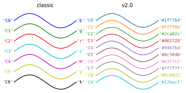 除了更改颜色之外,还添加了一种指定颜色的其他方法.以前,默认颜色是红色,绿色,蓝色,青色,品红色,黄色和黑色的单字符简写符号.这使得它们易于键入,并且可以在 plot 中的缩写样式字符串中使用,但是新的默认颜色仅通过十六进制值指定.为了在属性循环之外访问这些颜色,添加了颜色符号 'CN' ,其中 N 取值 0-9,表示 rcParams["axes.prop_cycle"] (default: cycler('color', ['#1f77b4', '#ff7f0e', '#2ca02c', '#d62728', '#9467bd', '#8c564b', '#e377c2', '#7f7f7f', '#bcbd22', '#17becf'])) 中的前 10 种颜色.有关更多详细信息,请参见 指定颜色 .