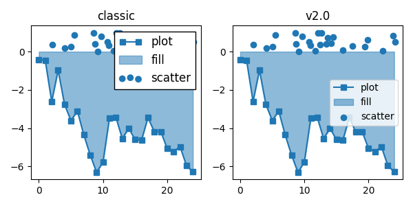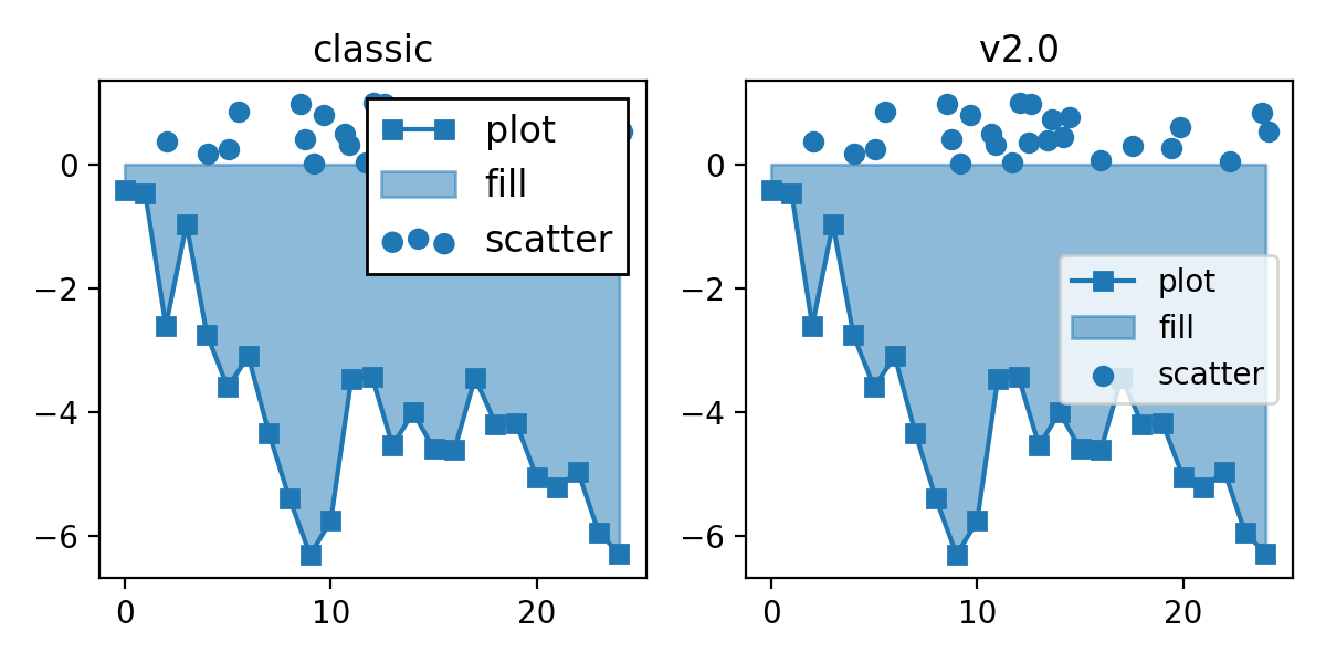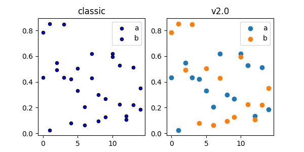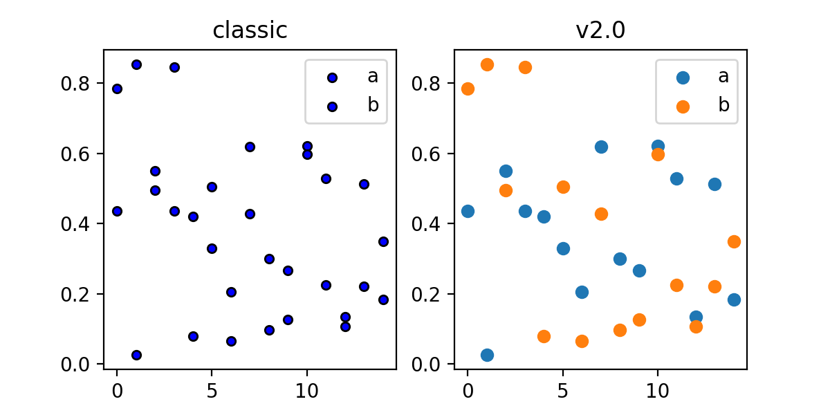 scatter 的经典默认行为只能通过 mpl.style.use('classic') 恢复.标记大小可以通过以下方式恢复: