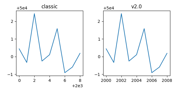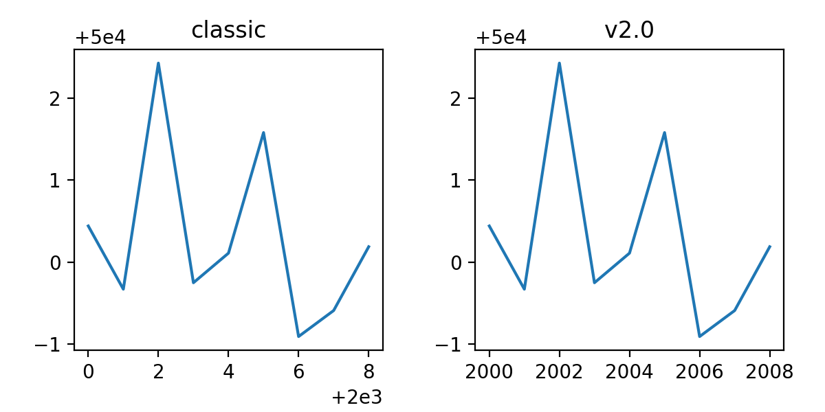 使用默认的 rcParams["axes.formatter.useoffset"] (default: True) ,当它可以节省4个或更多位数时,将使用偏移量.这可以通过新的 rcParams["axes.formatter.offset_threshold"] (default: 4) 来控制.要恢复使用偏移量来节省2个或更多位数之前的行为,请使用 rcParams['axes.formatter.offset_threshold'] = 2 .