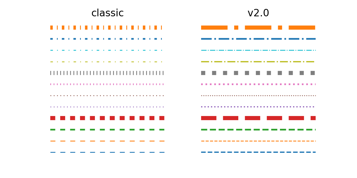 '--',':', 和'-.'关联的虚线模式已更改虚线模式现在随线宽缩放