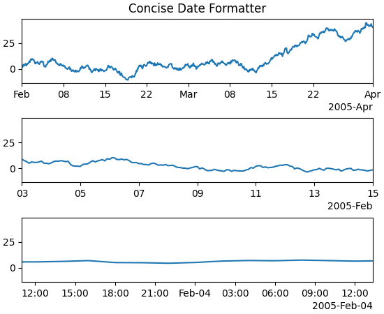 默认使用的自动日期格式化器可能非常冗长.可以访问一个新的格式化器,它尝试使刻度标签适当简洁.