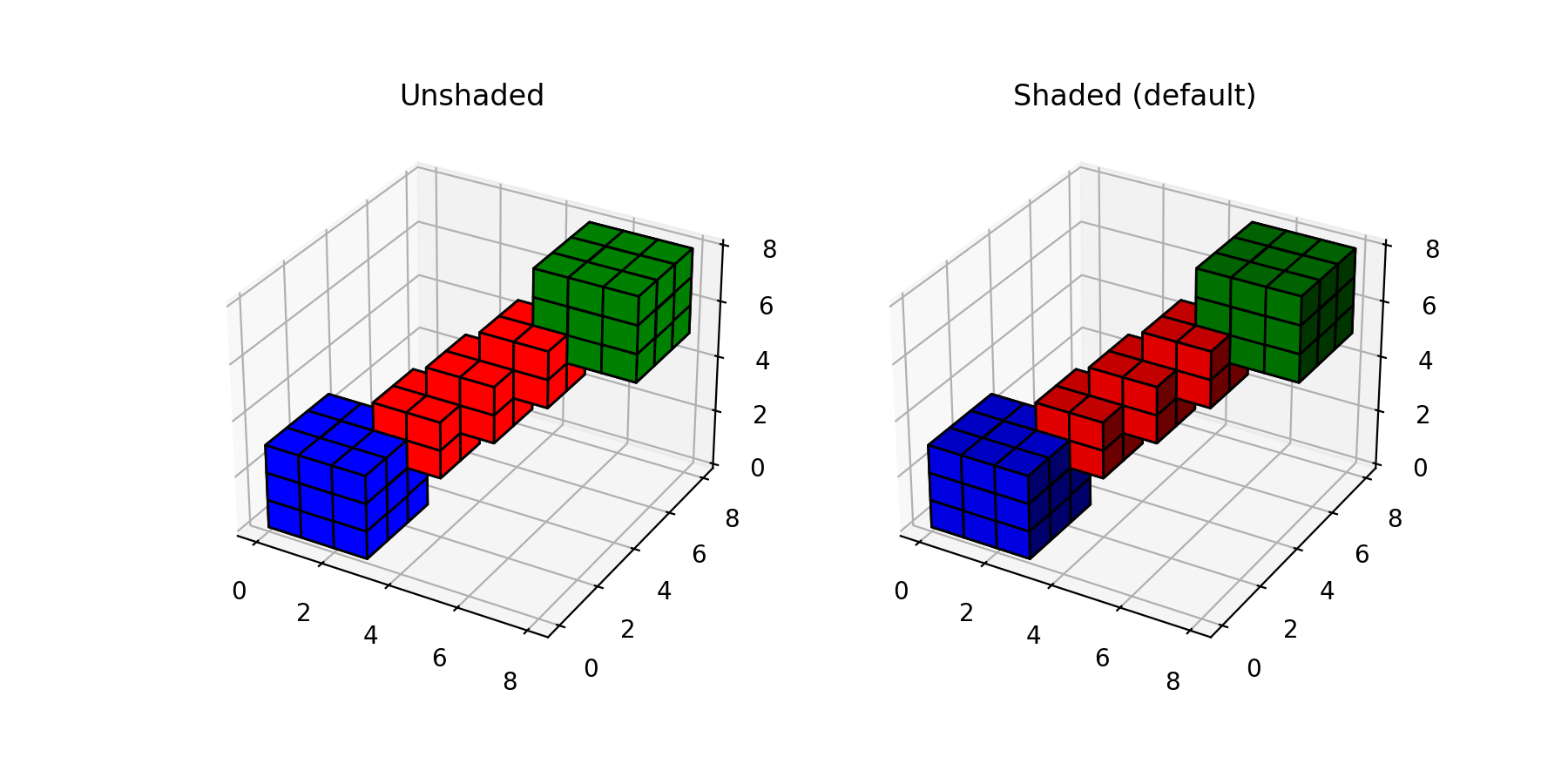 Axes3D.voxels 方法现在接受一个 shade 参数,该参数默认为 True . 这会根据面的朝向对它们进行着色,其行为就像 plot_trisurf() 和 bar3d() 的匹配参数一样. 下图显示了这如何影响输出.