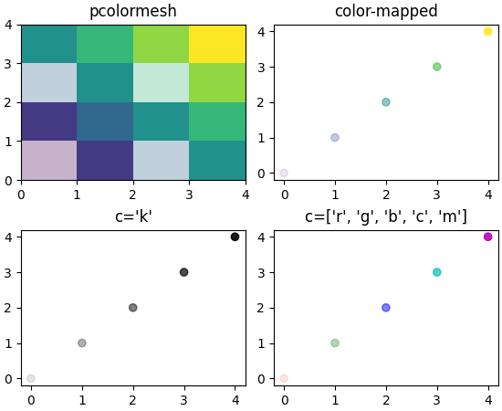 以前,控制集合中透明度的 alpha 值只能指定为应用于集合中所有元素的标量.例如, Axes.scatter 图中的所有标记,或 Axes.pcolormesh 图中的所有四边形都将具有相同的 alpha 值.