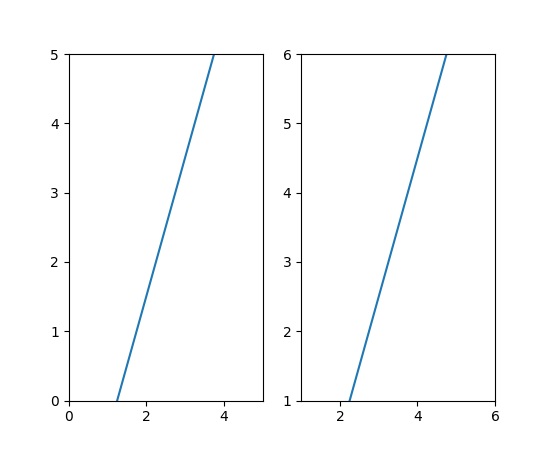 例如,这可以与 ax.transAxes 一起使用,用于绘制具有固定斜率的线条.在下面的图中,该线穿过两个 Axes 上的同一点,即使它们显示不同的数据限制.