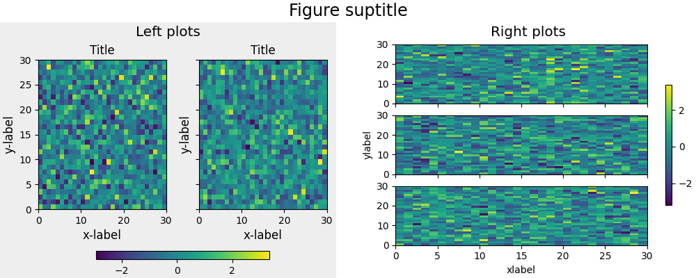 新的 figure.Figure.add_subfigure 和 figure.Figure.subfigures 功能允许在图形中创建虚拟图形.以前使用嵌套的 gridspecs 完成了类似的嵌套(参见 嵌套的 Gridspecs ).但是,这不允许仅与每个子 gridspec 相关的本地化图形艺术家(例如,颜色条或suptitle).