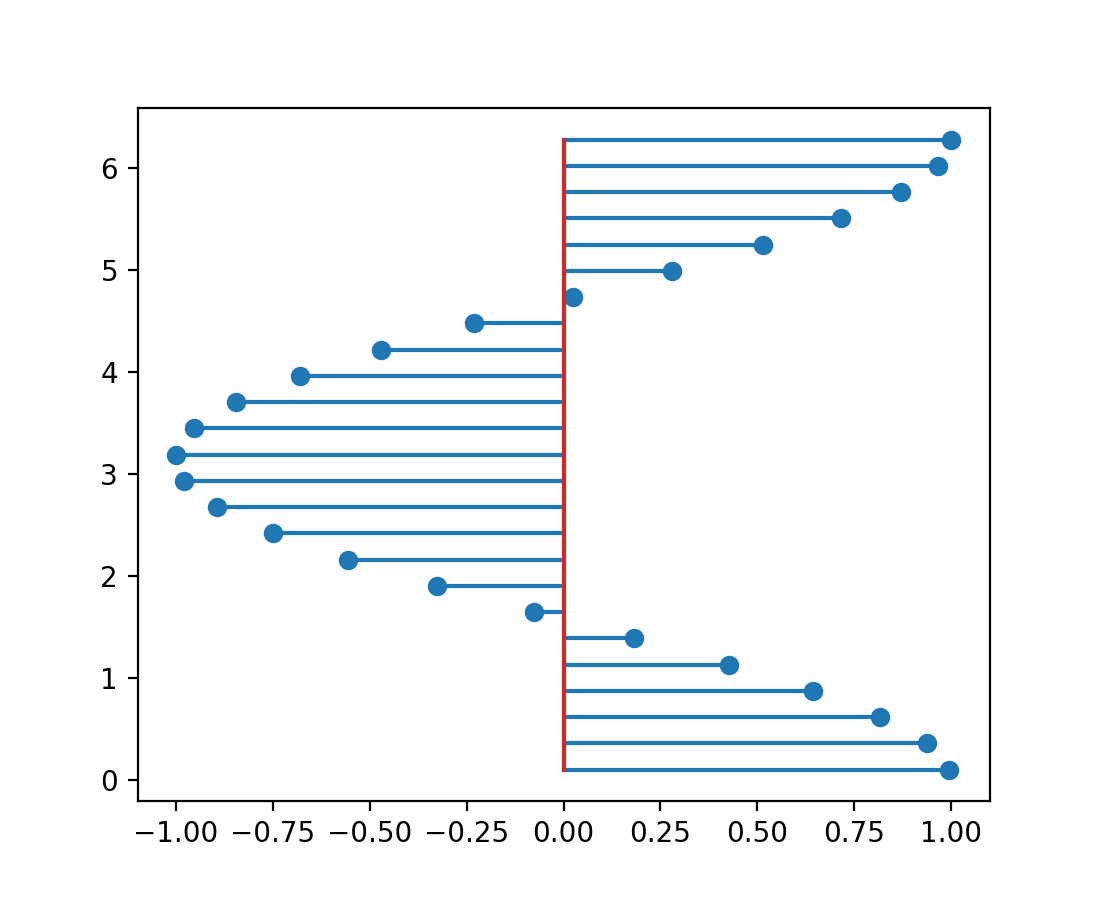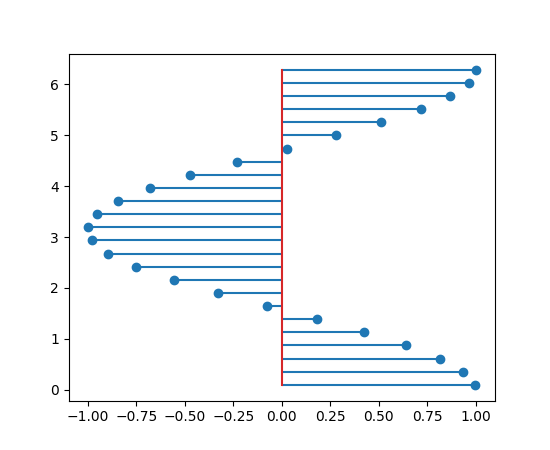 默认情况下,stem 线是垂直的.可以使用 Axes.stem 或 pyplot.stem 的 orientation 参数将其更改为水平: