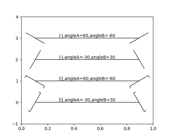 现在应用在 Bracket 箭头样式(传递给 FancyArrowPatch 的 arrowstyle 参数的 ]-[ , ]- , -[ 或 |-| )上指定的角度.以前,允许使用 angleA 和 angleB 选项,但不起作用.