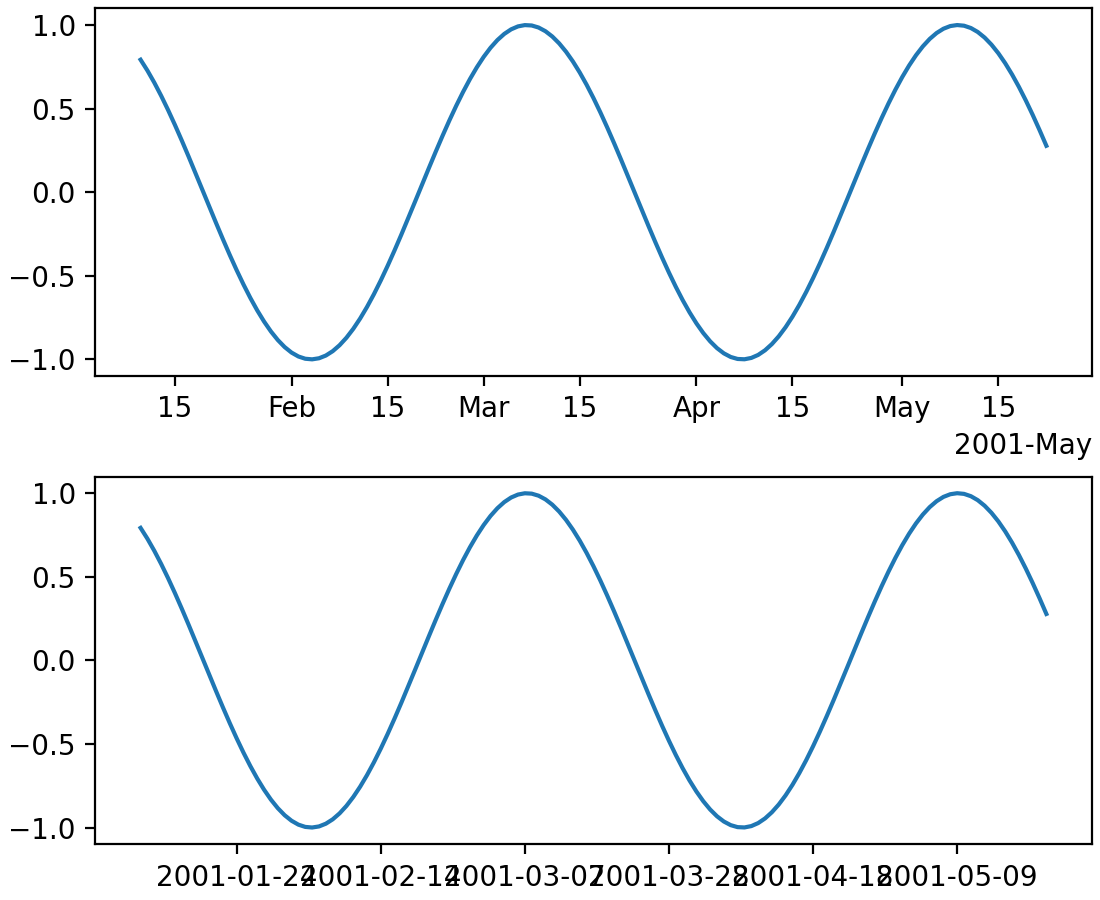 新的 rcParams["date.interval_multiples"] (default: True) 允许在日期定位器尝试以设定的间隔(即,每月的 1 号和 15 号)选取刻度,与从时间序列开始的任何位置开始的均匀间隔的刻度之间切换: